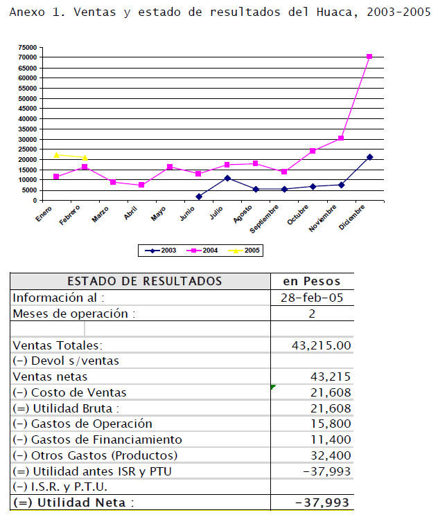 Las ventas que la empresa tuvo en el periodo junio-diciembre de 2003 (año en el que se inició el negocio) fue por $58,978.00 pesos mexicanos y tuvieron un comportamiento cíclico, las cuales fueron incrementando mensualmente, siendo diciembre el mes donde se reportaron ventas mayores.