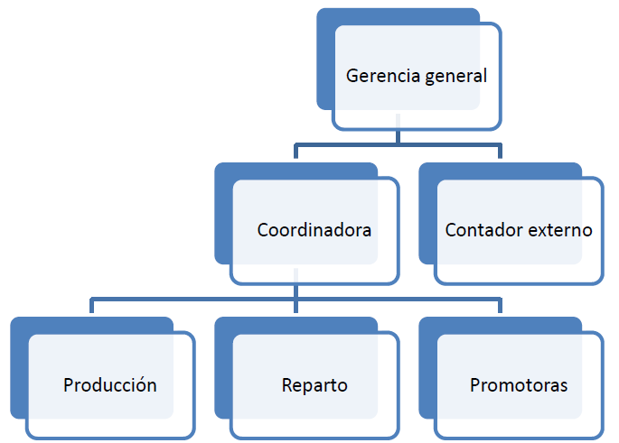 Helena Rabelo indicaba que aunque no poseía un organigrama formal, si se contaba con el personal que tenía funciones específicas, por ejemplo la licenciada Lucrecia Cámara era la coordinadora general, también estaba la persona responsable de compras y producción, quien colaboraba directamente con la encargada de la planta. Además contaban con un chofer y degustadoras que realizaban su trabajo en las tiendas donde se distribuían los productos. Para los asuntos contables y fiscales contaban con un contador externo (Ver figura 1).